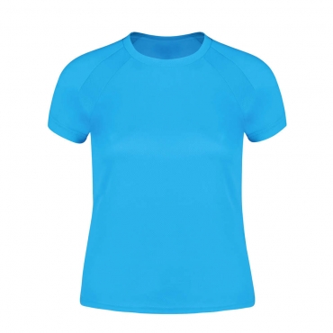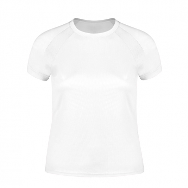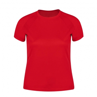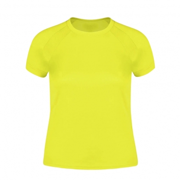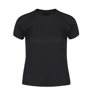 Camiseta técnica para mujer en material 100% poliéster transpirable de 135g/m2. Con manga ranglán, cuello redondo y con bandas frontales y laterales en tejido transpirable microperforado. Disponible en tallas S, M, L, XL.